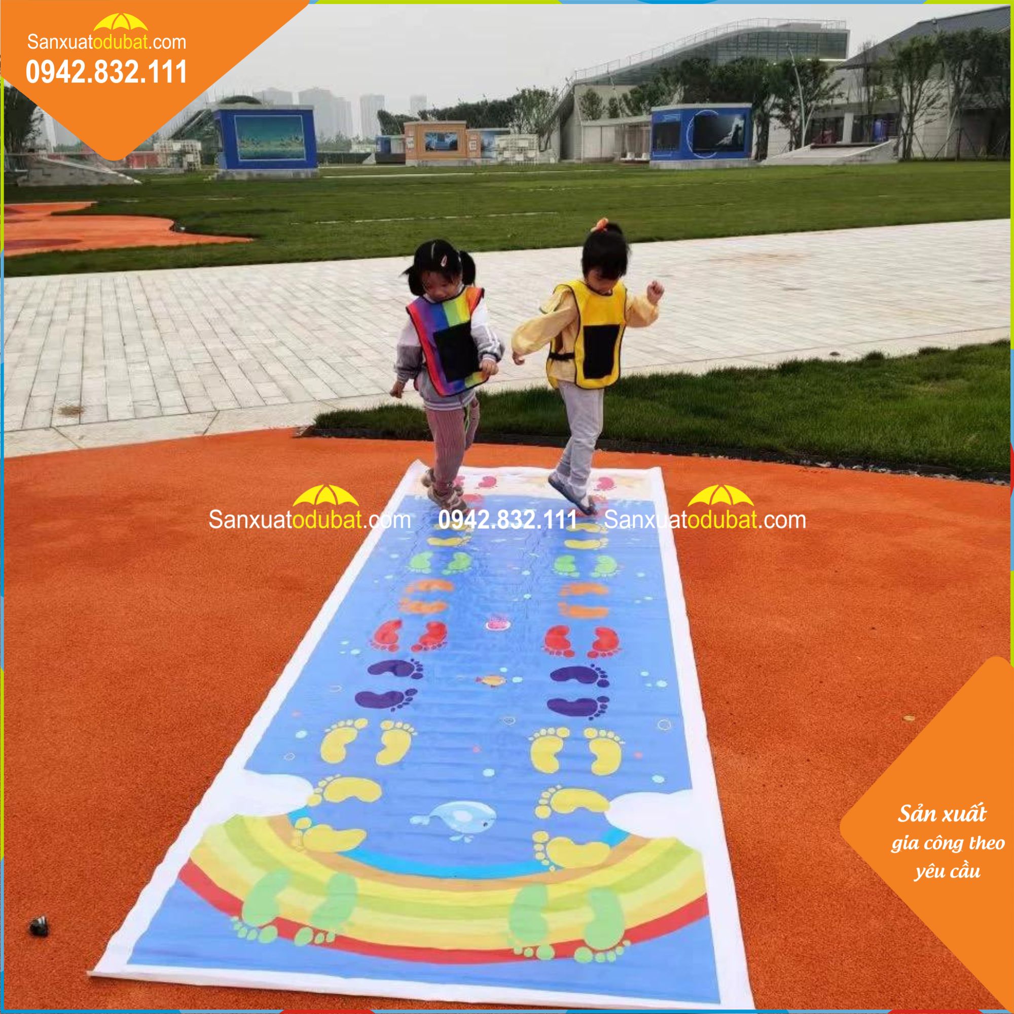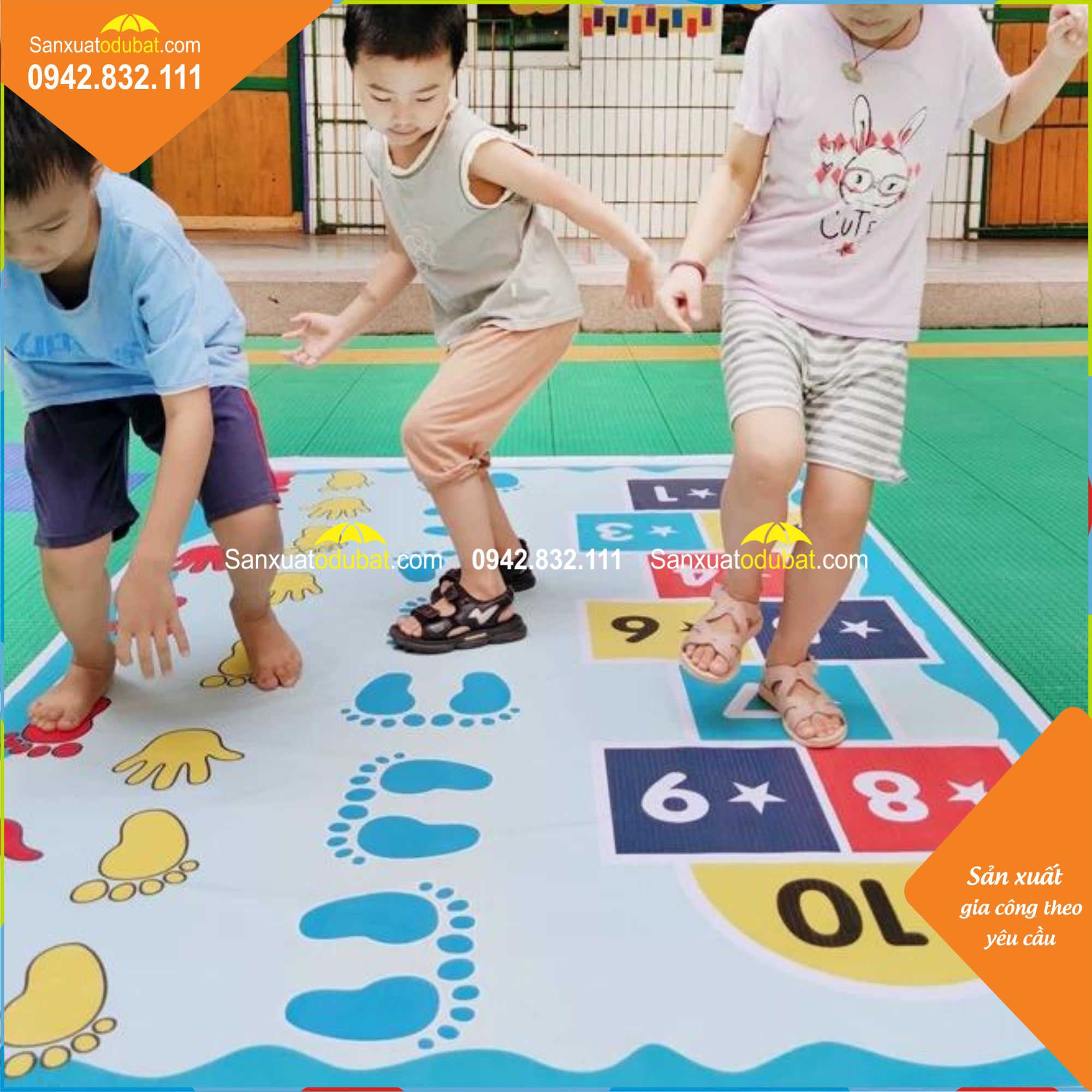 - Thảm thường có kích thước tiêu chuẩn 1,2m x 3m hoặc 1,2m x 2,8m, được làm từ chất liệu bạt PVC cao cấp chống thấm, dễ lau chùi, an toàn cho trẻ nhỏ.